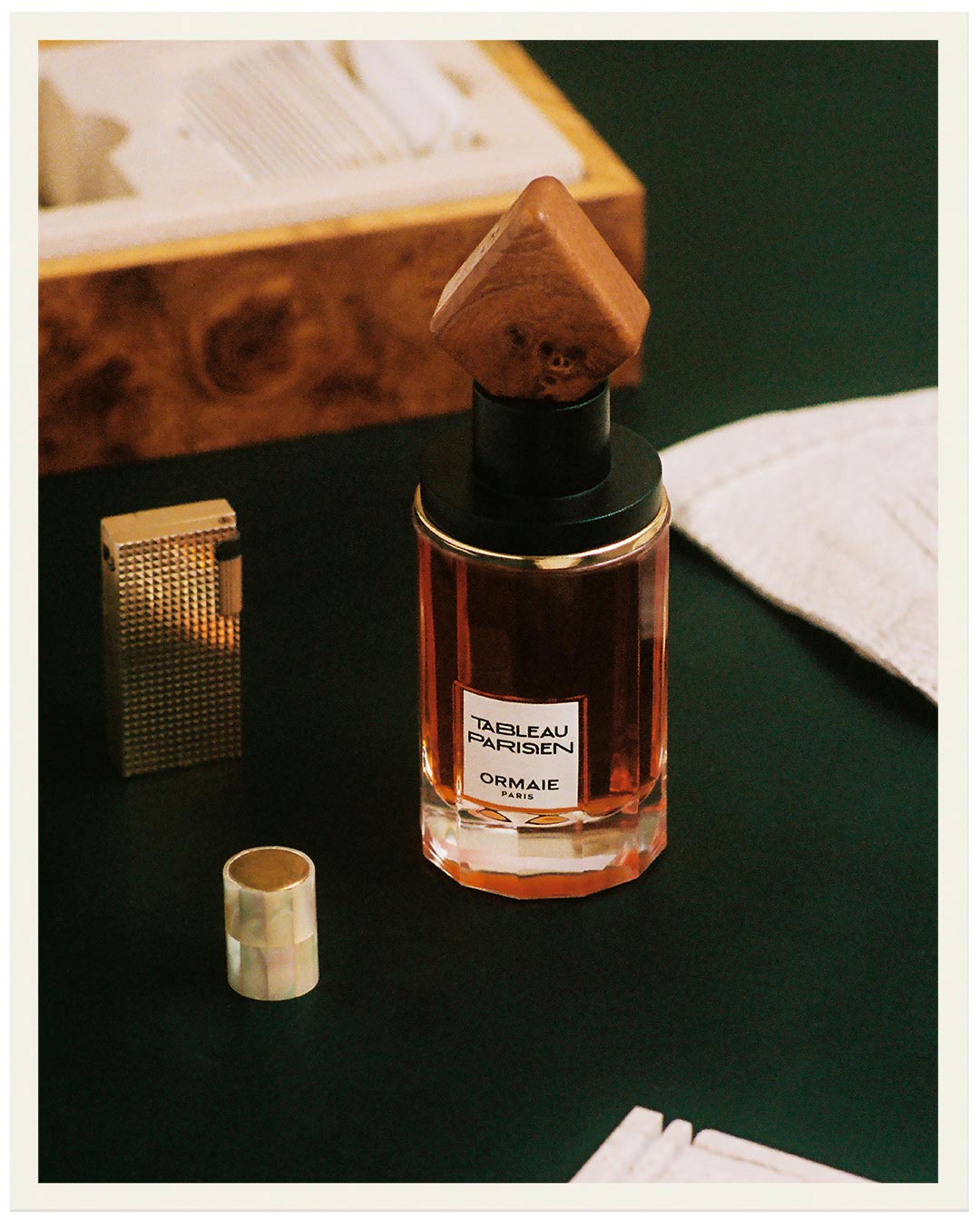 Un vidrio facetado doce veces, como un reloj de sol, como testimonio del largo proceso de creación. Sus tapones de madera, influidos por el amor de Bouygues a las esculturas de Brâncusi, son una interpretación física de cada fragancia.